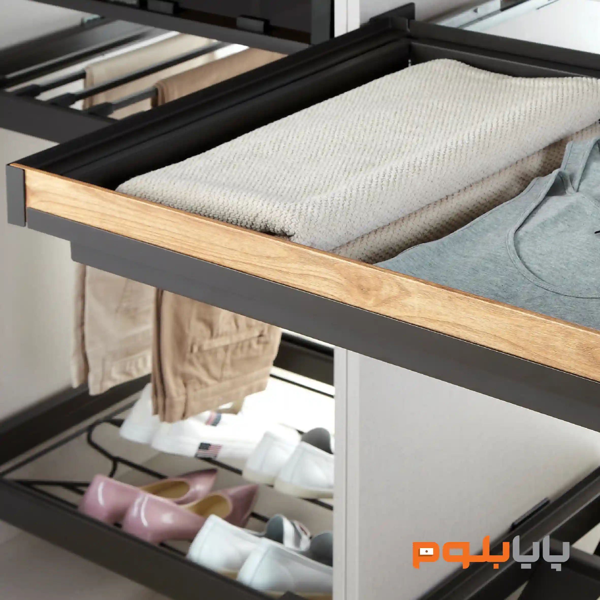 این طبقه کشویی با فرانت چوب، زیبایی و گرما را به فضای داخلی کمد شما میآورد. این ترکیب از فلز مستحکم و چوب طبیعی، نه تنها ظاهری لوکس و مدرن به آن میبخشد، بلکه کارایی و دوام بالایی نیز دارد. از دیگر ویژگیهای برجسته این محصول، سیستم آرامبند قابل رگلاژ آن است که به شما اجازه میدهد سرعت بسته شدن کشو را بر اساس نیاز خود تنظیم کنید.