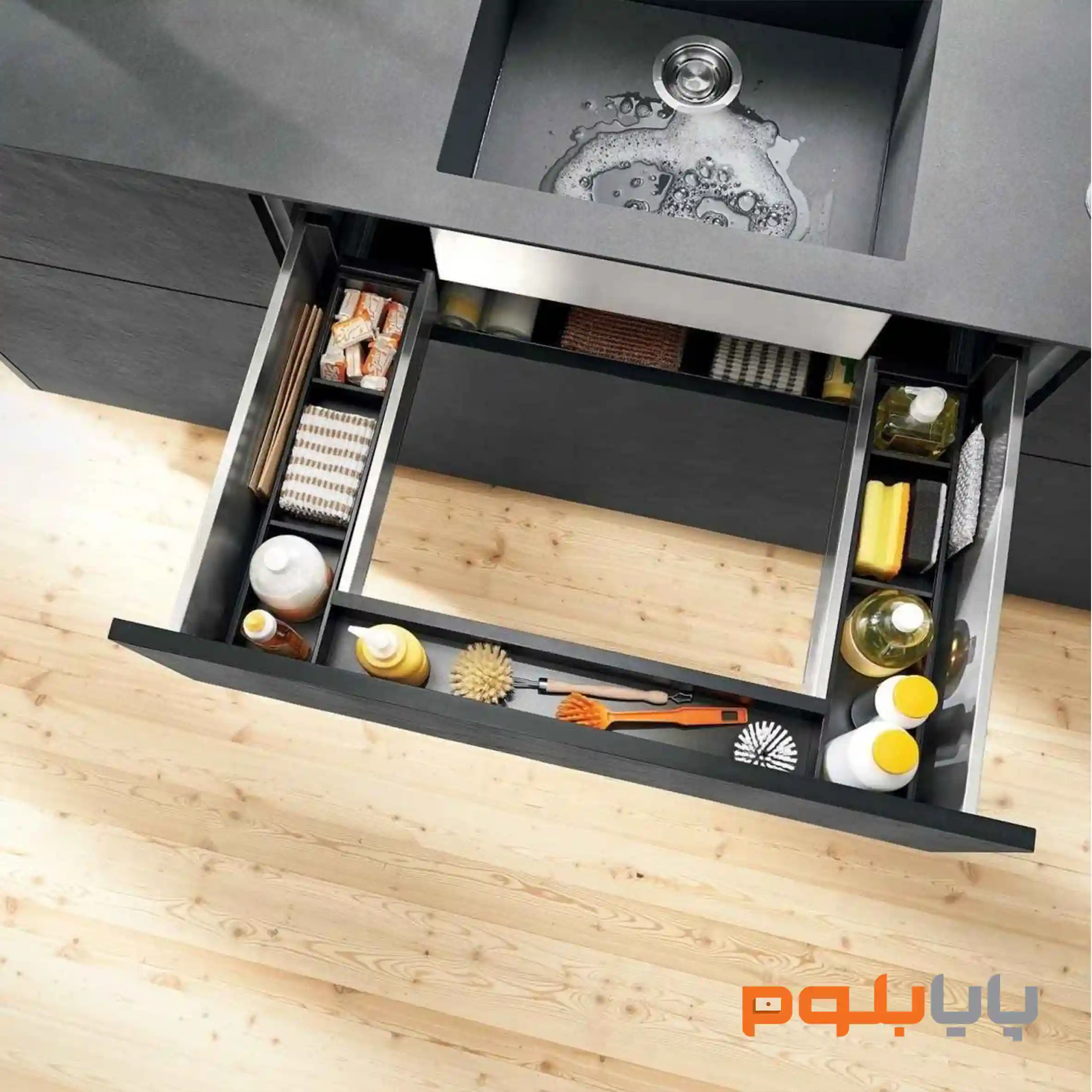 کشو زیرسینکی لگراباکس بلوم، راهحلی ایدهآل برای بهینهسازی فضا و ذخیرهسازی لوازم مورد نیاز شما میباشد. دو عدد تقسیمکننده که در دو طرف این کشو قرار دارد، محلی مناسب برای ذخیرهسازی لوازم مورد نیاز شما مانند مایع شستوشو، ابرها، سیمها، اسکاچهای شستوشو و… میباشد. ریلهای این کشوها از دید پنهان بوده و حرکتی نرم و بینظیر را در تمام طول عمر کابینتها برای شما به ارمغان میآورند. همچنین نوع حرکت ریلها به صورت فولاکستنشن بوده که باعث میشود کشوها به صورت کامل از کابینت بیرون آمده و باعث میشود تا دسترسی شما به فضای داخل کشوها هر چه راحتتر و بهتر شود. جنس کنارههای بدنهی کشو از فلز بوده، در نتیجه شما نیازی به نگرانی در مورد مقاومت این کشوها نخواهید داشت.