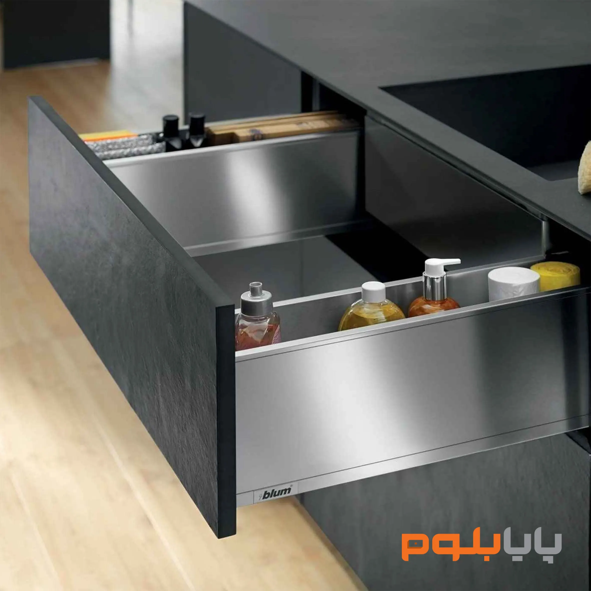 کشو زیر سینکی بلوم، راهحلی ایدهآل برای بهینهسازی فضا و ذخیرهسازی لوازم مورد نیاز شما است. خالی بودن قسمتی از کشو که زیر سینک قرار میگیرد، باعث میشود تا نصب راحتتر انجام شود و تداخلی با لولهکشیهای زیر سینک به وجود نیاید. دو عدد تقسیمکننده که در دو طرف این کشو قرار دارد، محلی مناسب برای ذخیرهسازی لوازم مورد نیاز شما مانند مایع شستوشو، ابر، سیم، اسکاچ و… است. ریلهای این کشوها از دید پنهان بوده و حرکتی نرم و بینظیر را در تمام طول عمر کابینتها برای شما به ارمغان میآورند. همچنین نوع حرکت ریلها به صورت فولاکستنشن بوده که باعث میشود کشوها به صورت کامل از کابینت بیرون آمده و باعث میشود تا دسترسی شما به فضای داخل کشوها هر چه راحتتر و بهتر شود. جنس کنارههای بدنهی کشو از فلز بوده، در نتیجه شما نیازی به نگرانی در مورد مقاومت این کشوها نخواهید داشت.