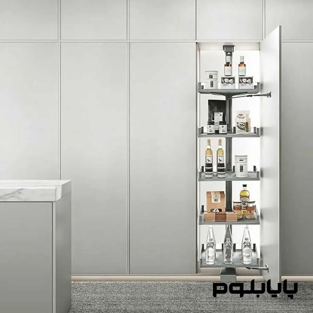 برای بهینهسازی فضاهای عمودی و بلند در آشپزخانه، نیاز به راهحلهای ذخیرهسازی هوشمندانهای داریم که دسترسی به اقلام را آسان کنند. سوپر کانوی، یک ابتکار عالی در این زمینه است که فضای کابینتهای بلند را به یک انبار مواد غذایی منظم و قابل دسترس تبدیل میکند. با این سیستم، دیگر نیازی به جستجو در عمق کابینتها ندارید و همه چیز به راحتی در دسترس شماست.
