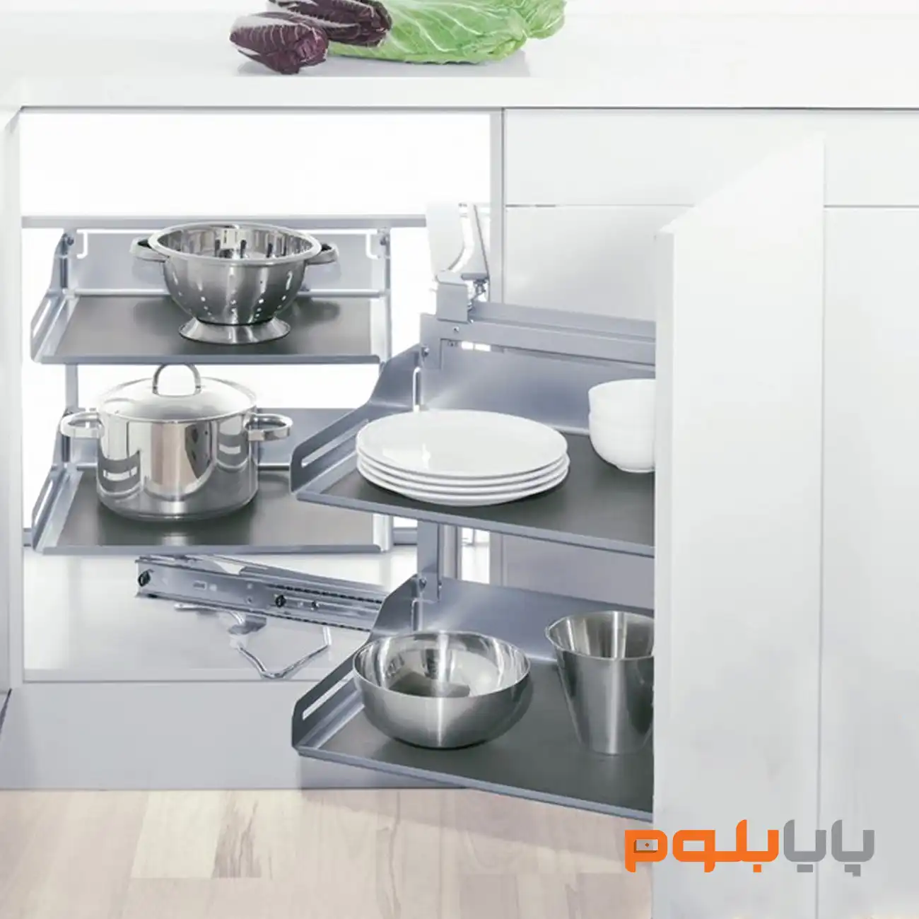 مجیک استاندارد، بهترین راهحل برای استفاده بهینه از فضای کابینتهای کنج است. این محصول متشکل از دو واحد جدا، یکی قفسههای کشویی و یکی قفسههای چرخشی است. با باز کردن درب و بیرون کشیدن قفسههای چرخشی، قفسههای ریلی به صورت اتوماتیک بیرون میآیند که این مساله به شما کمک میکند دید کاملی از تمامی محتویات داخل قفسه داشته باشید. همینطور با استفاده از قابلیت SoftClose قفسهها به نرمی به داخل کابینت هدایت میشوند. تمامی قفسهها به راحتی قابل جدا کردن و جا افتادن هستند، تا نظافت آنها برای شما تجربهای کم دردسر و راحت باشد. این سیستم میتواند هم در سمت راست و هم در سمت چپ کابینت نصب شود. مجیک استاندارد، مناسب برای قفسهبندی قاشق، چنگال و مواد غذایی است.