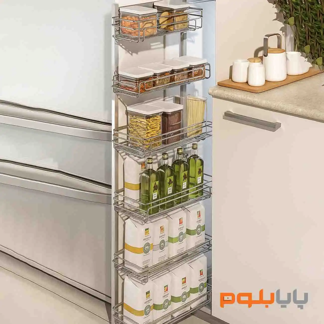 این سوپر پهلو با طراحی منحصر به فرد خود، به راحتی در فضاهای باریک کابینت نصب میشود و دسترسی به تمامی محتویات آن را تنها با یک حرکت ساده فراهم میکند. پنج طبقه مجزا، فضای کافی برای نگهداری و نظمدهی به انواع قوطیها، بطریها، کنسروها و خشکبار را فراهم میآورد. هر یک از این طبقات، قابلیت تحمل بار تا حداکثر ۵ کیلوگرم را دارد که آن را به گزینهای بسیار مطمئن برای نگهداری اقلام مختلف تبدیل میکند. یکی از ویژگیهای برجسته این محصول، قابلیت نصب از هر دو سمت (چپ یا راست) و اتصال مستقیم به درب کابینت است که استفاده از آن را بسیار آسان میکند.