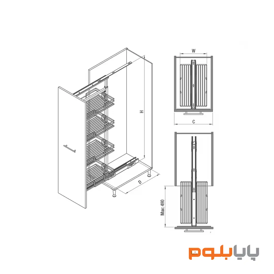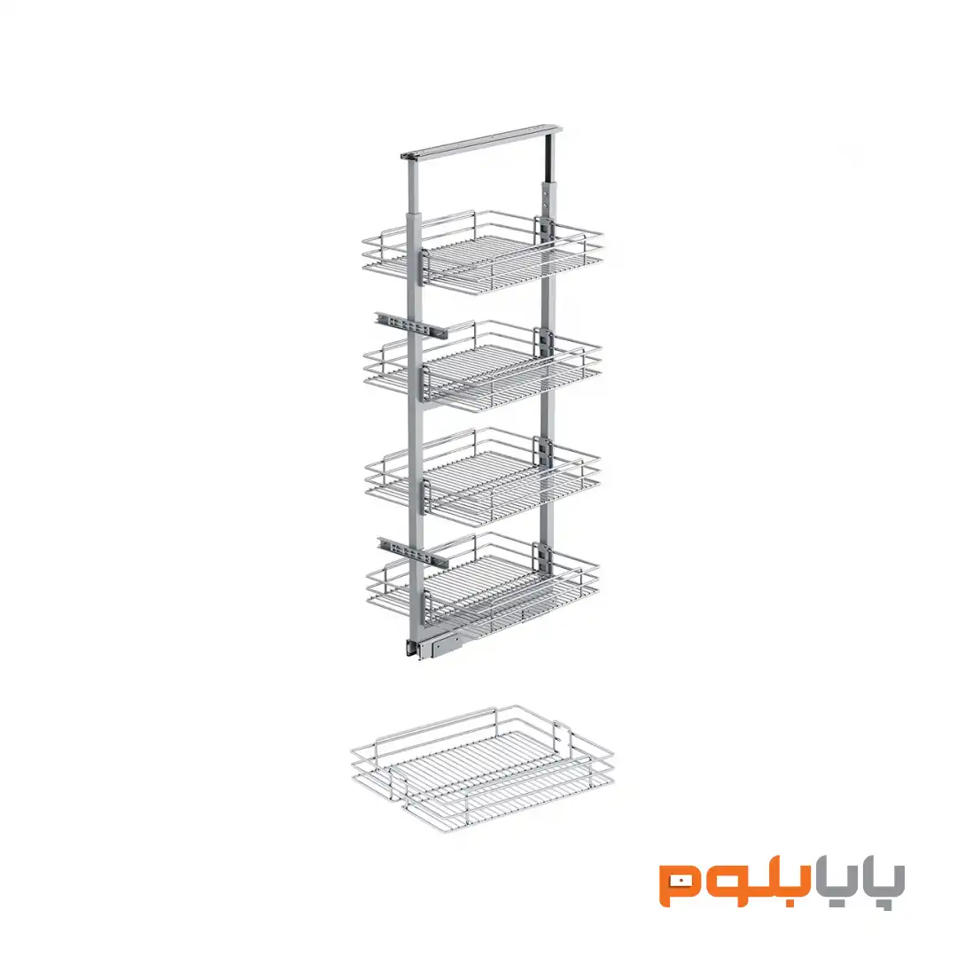 ریل این سبد به کف و سقف یونیت پیچ میشود و به صورت ساده و ایستاده از کابینت بیرون میآیند. امکان نصب درب به تجهیزات داخل کابینتی از قابلیتهای این محصول است که میتوان آن را به درب کابینت وصل کرد و با جلو کشیدن درب یونیت، سوپری نیز خارج میشود.