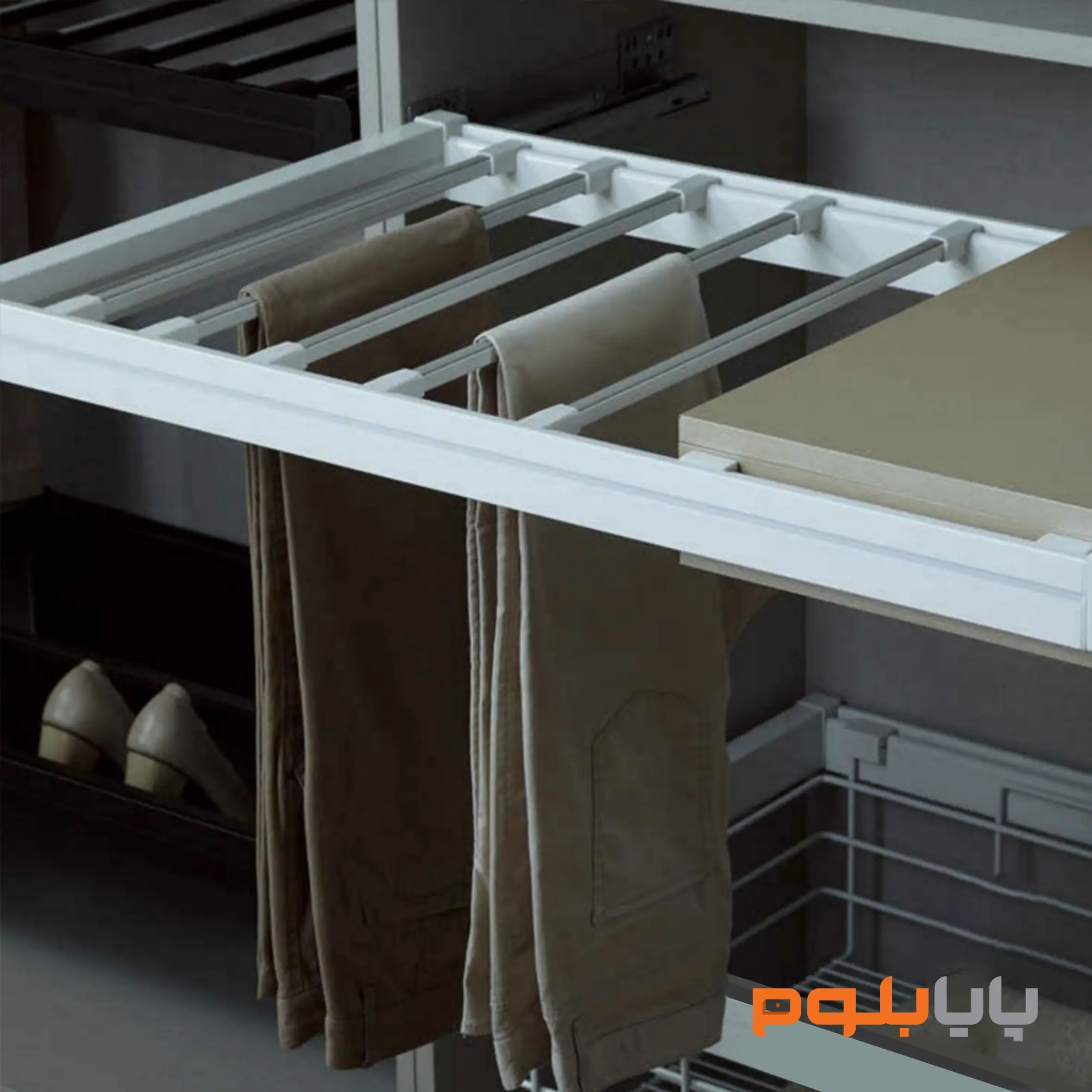 • این محصول برای چیدمان و استفاده بهینه از فضای داخل کمد اتاق طراحی شده است، که علاوه بر جای شلوار، باکسی مجزا برای زیورآلات در آن تعبیه شده است.دارای ریل آرام‌بند و حرکتی آرام و بی‌صدا استمناسب برای یونیت‌های عرض 90 سانتی‌متر و حداقل عمق 48 سانتی‌متر با قابلیت رگلاژ است